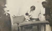 Demonstration to Wayfarers by Mrs Davies A photograph album compiled by Mary Butler, containing photographs of Wayfarers, Sunbeams and Pathfinders, mostly in Cradock. Two newspaper clippings and a handwritten concert programme included. There are three photographs of Rev. James Arthur Calata's young daughters, and he himself is included in two photographs. This photograph showing Mrs Davies and two mothers demonstrating to Wayfarers on how to take care of infants. Probably one of infant/toddler progam run by missionary wives to educate African women