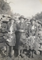 European women Wayfarers A photograph album compiled by Mary Butler, containing photographs of Wayfarers, Sunbeams and Pathfinders, mostly in Cradock. Two newspaper clippings and a handwritten concert programme included. There are three photographs of Rev. James Arthur Calata's young daughters, and he himself is included in two photographs. This photograph showing three European women Wafarer Officers carrying flower bouquet