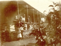 Dispensary with additional room donated by Alfred Metcalf A photograph album compiled by Mary Butler, containing photographs of Wayfarers, Sunbeams and Pathfinders, mostly in Cradock. Two newspaper clippings and a handwritten concert programme included. There are three photographs of Rev. James Arthur Calata's young daughters, and he himself is included in two photographs. This photograph showing a group of people and two nurses standing infront of a dispensary or health clinic. They have probably come to collect medicine, or to get medical treatment