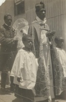 Elsie's wedding A photograph album compiled by Mary Butler, containing photographs of Wayfarers, Sunbeams and Pathfinders, mostly in Cradock. Two newspaper clippings and a handwritten concert programme included. There are three photographs of Rev. James Arthur Calata's young daughters, and he himself is included in two photographs. This photograph showing an African wedding ceremony, bride and groom led by the priest and two young boys wearing church outfit, probably alter servers