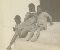 James Arthur Calata's three daughters A photograph album compiled by Mary Butler, containing photographs of Wayfarers, Sunbeams and Pathfinders, mostly in Cradock. Two newspaper clippings and a handwritten concert programme included. There are three photographs of Rev. James Arthur Calata's young daughters, and he himself is included in two photographs. This photograph showing James Arthur Calata's three daughters sitting on the stoep, probably their house. They are probably looking at photographs or reading letters. J.A. Calata had three daughters, namely, Nontsikelelo, Noluthando and Vuyiseka (born in 1922)