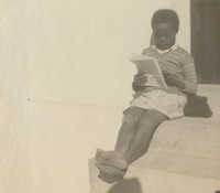 James Arthur Calata's daughter A photograph album compiled by Mary Butler, containing photographs of Wayfarers, Sunbeams and Pathfinders, mostly in Cradock. Two newspaper clippings and a handwritten concert programme included. There are three photographs of Rev. James Arthur Calata's young daughters, and he himself is included in two photographs. This photograph showing one of James Arthur Calata's daughters sitting on the stoep reading a book