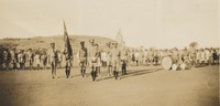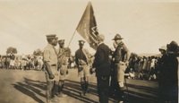 Pathfinder flag bearers A photograph album compiled by Mary Butler, containing photographs of Wayfarers, Sunbeams and Pathfinders, mostly in Cradock. Two newspaper clippings and a handwritten concert programme included. There are three photographs of Rev. James Arthur Calata's young daughters, and he himself is included in two photographs. This photograph showing a church group of young boys, known as Pathfinders in uniform, marching and bearing a flag at a Pathfinder camp
