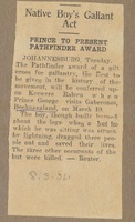 Press cutting titled "Native boys's gallant act: Prince to present Pathfinder Award" A photograph album compiled by Mary Butler, containing photographs of Wayfarers, Sunbeams and Pathfinders, mostly in Cradock. Two newspaper clippings and a handwritten concert programme included. There are three photographs of Rev. James Arthur Calata's young daughters, and he himself is included in two photographs. This press cutting relating to the Pathfinder award to be presented to Kecwere Raleru, an African boy, by Prince George, for showing bravery when he saved the lives of three people from a burning hut by dragging them out