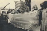 Pathfinder detachment flag presented by Mr A. Metcalf A photograph album compiled by Mary Butler, containing photographs of Wayfarers, Sunbeams and Pathfinders, mostly in Cradock. Two newspaper clippings and a handwritten concert programme included. There are three photographs of Rev. James Arthur Calata's young daughters, and he himself is included in two photographs. This photograph showing Mr A. Metcalf presenting a Pathfinder detachment flag to a group of older boys, representing Pathfinders. Standing next to him are Pathfinder officers and other people who have come to the presentation