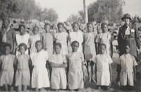 Wayfarers and their officers, 1935 A photograph album compiled by Mary Butler, containing photographs of Wayfarers, Sunbeams and Pathfinders, mostly in Cradock. Two newspaper clippings and a handwritten concert programme included. There are three photographs of Rev. James Arthur Calata's young daughters, and he himself is included in two photographs. This photograph shows a group of young girls, Wayfarers and their two officers wearing uniform