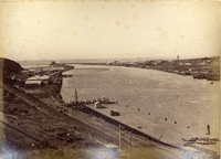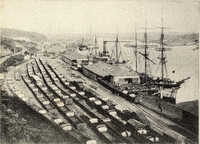 The Harbour entrance, wharves, and shipping on the Buffalo River, and railway waggons, East London Harbour entrance, East London, South Africa. Showing ships and railway wagons.
