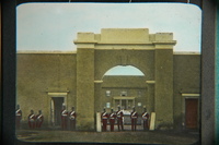 Drostdy Arch from Drostdy View of ten uniformed men in the arched gateway to the Drostdy, with the Drostdy itself visible behind them.