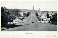 A historical landscape photograph of Grahamstown, described in the caption as one of the leading ecclesiastical and educational centres in South Africa. The view shows the Anglican Cathedral, designed by Sir Gilbert Scott, standing on high ground in the centre of the city. The Grand Hotel is visible to the right. The city is noted for being situated in an amphitheatre of wooded hills. -