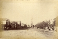 High Street, Grahamstown, with view of the Cathedral of St Michael and St George, circa 1870 View of an almost deserted High Street, looking eastwards towards the Cathedral of St Michael and St George. The photograph is mounted on card which bears the inscription 'The Cathedral High Street Grahamstown'. It predates the building of the Cathedral spire, completed in 1878.