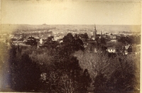 High Street, Grahamstown, and the intersection of Worcester Street and Somerset Street, circa 1880 Two photographs stuck on card, of: (a) View of High Street, Grahamstown, showing the Cathedral of St Michael and St George with the spire, completed in 1878. The Settlers Memorial Tower, completed in 1870, can be seen to the left. (b) View of the intersection of Worcester and Somerset Streets, Grahamstown, with a Victorian fluted pillar box ca. 1859-60 in the foreground, reputed to be the oldest official letter box in South Africa. The house of the Headmaster of St Andrew's College is visible behind it, with Christchurch, built in 1876, in the distance. The latter photograph was taken by Aldham and Aldham, photographers active in Grahamstown from1879-1905.