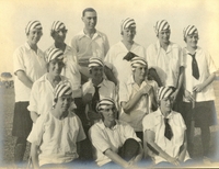 Grahamstown Ladies Hockey Club on Tour, 1923 Grahamstown Ladies Hockey Club on Tour 1923, On tour – 1923, Team photograph with hockey players wearing dark skirts and white shirts, striped caps on their heads, Group photograph, Black and white photograph, Outdoor photograph, Standing hockey players holding hockey sticks, Back Row: J. Milroy, I. Keey, Mr. Sherman, D. Wallace, P. Greenway, D. Wallace, Middle Row: J. Brook, E. Wallace, M. Style, Front Row: L. Milroy, K. Wetr (Captain), D. Keey.