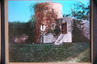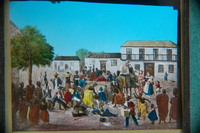 Old Mill in George Street Painting showing the Old Mill on the corner of George and Market Streets, and on the left corner, the home of Mr George Wood, first Mayor of Grahamstown. The small cart was used to carry Miss Josie Wood (founder of the South African Library for the Blind) to school.