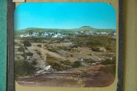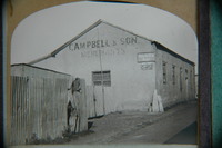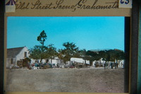Old Street scene in High Street, Grahamstown, looking south View showing the south side of upper High Street, from "Charles Pote's Auction Rooms" on the corner of Hill Street, as far as Hayton's Building. Trees, an ox wagon and people obscure the buildings.