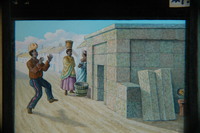 Untitled reproduction of pen-and-ink sketch by W. Guybon Atherstone from the steps of the Drostdy looking down High Street, dated 3 May 1830 Facebook post (dated 22 February 2021) by Gareth Angelbeck: "A reproduction of a pen-and-ink sketch by W. Guybon Atherstone from the steps of the Drostdy looking down High Street, dated 3 May 1830. The three-storied building at the corner of High Street (now Major Frasiers) is known to have been built by Pieter Retief. All subsequent illustrations show it with two stories only, and the alteration must have taken place several decades before the advent of photography. The sketch also shows an open water furrow, leading from the bottom right corner to the top of High Street. This was the public water supply of the town in 1830, which was led to open tanks at various points in the town. Colonel Graham's mimosa tree is shown, in the middle of High Street, a short distance from St. George's Church (later, the Cathedral). This tree, marking the traditional spot where the decision to found Grahamstown was made on 14 August 1812, was destroyed in a gale in 1844. (Ref- Grahamstown in Early Photographs, F van der Riet, David Philip pub, CT, 1974)."