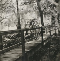 Two young girls on a wooden bridge over Kowie Ditch in the Grahamstown Botanical Gardens Photograph of two young girls (possibly Ann and Elizabeth Kerr) on a wooden bridge over Kowie Ditch in the Grahamstown Botanical Gardens,Leila Kerr (Linington) (Donor)