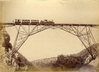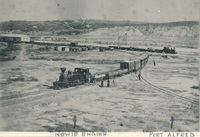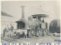 Kowie Engine at Port Alfred Note on the bottom: “Kowie Engine” and “Port Alfred”. d. Note on the back: “The first two engines for 3’-6” gauge working between Port Alfred and Grahamstown Landed by SS Rothsay May 20th 1882 – Ran first trial trip from Port Alfred for 16 miles pn the 25th July 1882. Engine made my the Hunsletics & Leeds. The Kowie Engine was the passing engine [illegible] 22 Tom “Grahamstown” “Port Alfred” engine for Goods working washing 25 Tom or “Kowie”".,Kowie engine at Port Alfred.