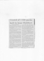 Crowd of 1 600 packs hall to hear Slabbert Newspaper clipping reporting on the address by Dr Frederik van Zyl Slabbert (IDASA Executive Director), at the Feather Market Hall in Port Elizabeth. Dr. Slabbert addressed a crowd of 1600 interested parties, with the message of the address focussing on the outcomes of the political discussions held in Dakar, Senegal, between the 9th and 12th of July 1987, between members of IDASA and the ANC.