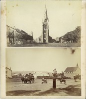 High Street, Grahamstown, and the intersection of Worcester Street and Somerset Street, circa 1880 Two photographs stuck on card, of: (a) View of High Street, Grahamstown, showing the Cathedral of St Michael and St George with the spire, completed in 1878. The Settlers Memorial Tower, completed in 1870, can be seen to the left. (b) View of the intersection of Worcester and Somerset Streets, Grahamstown, with a Victorian fluted pillar box ca. 1859-60 in the foreground, reputed to be the oldest official letter box in South Africa. The house of the Headmaster of St Andrew's College is visible behind it, with Christchurch, built in 1876, in the distance. The latter photograph was taken by Aldham and Aldham, photographers active in Grahamstown from1879-1905.