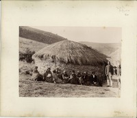 Xhosa hut View of a thatched hut, showing clearly the wattle and daub construction. Two men in western dress are shown with ten seated women, all in traditional headscarves and blankets. The card mount has an inscription in the upper right corner: 'South Africa. 30'.