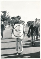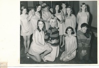 Group photo of Gail Martin and other young people at Rhodes University Scope Nite, 1968 Group photo of Gail Martin and other young people at Rhodes University Scope Nite 1968: Standing, left to right: Sally Lang, Gretchen Hofmeyr, Doug Skunnen, Zanne Rosenthal, Dawn Little, Gail Martin, Sandy Lippstreu. Seated, left to right: Jean Summer, Dee Keery, Margie Savage, Judy Hanley. Posed group photograph of young women in polka dot dresses or striped shirts and jeans. Doug Skunnen is in the uniform of a United Nations soldier. -
