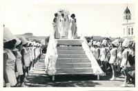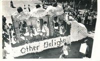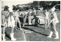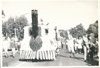 Rag week float with Rag Queen flanked by drum majorettes, 1966 -
