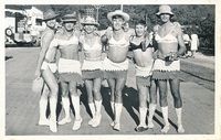 Pete Cleary and Des Bromwell with young men of bum majorettes -