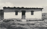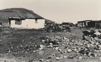 White rural house with rocks on top A series of twenty photographs showing scenes of houses (new and old) and landscape of the Oxton and Zweledinga areas of resettlement under the forced removals policy, 1980. Most of the community settled here had voluntarily left Glen Grey and Herschel in 1976, to avoid incorporation into the Transkei homeland, only to be incorporated, at a later date, into Ciskei instead. These photographs were taken by Priscilla Hall.