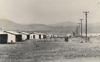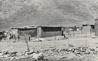 Four rural houses near fence and the start of a hill with rocks A series of twenty photographs showing scenes of houses (new and old) and landscape of the Oxton and Zweledinga areas of resettlement under the forced removals policy, 1980. Most of the community settled here had voluntarily left Glen Grey and Herschel in 1976, to avoid incorporation into the Transkei homeland, only to be incorporated, at a later date, into Ciskei instead. These photographs were taken by Priscilla Hall.