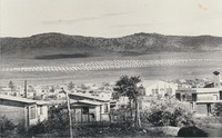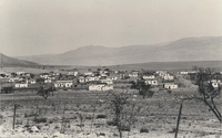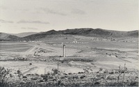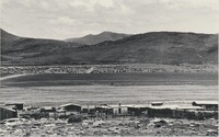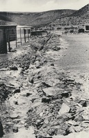 Big hill with houses in front a gravel road and fencing A series of twenty photographs showing scenes of houses (new and old) and landscape of the Oxton and Zweledinga areas of resettlement under the forced removals policy, 1980. Most of the community settled here had voluntarily left Glen Grey and Herschel in 1976, to avoid incorporation into the Transkei homeland, only to be incorporated, at a later date, into Ciskei instead. These photographs were taken by Priscilla Hall.