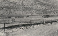 Rural area in valley with hills and fence surrounding it A series of twenty photographs showing scenes of houses (new and old) and landscape of the Oxton and Zweledinga areas of resettlement under the forced removals policy, 1980. Most of the community settled here had voluntarily left Glen Grey and Herschel in 1976, to avoid incorporation into the Transkei homeland, only to be incorporated, at a later date, into Ciskei instead. These photographs were taken by Priscilla Hall.