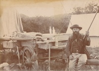 A hunter with his rifle sitting next to an ox wagon