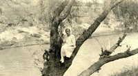 A woman sitting in a tree next to a stream
