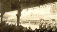 Pathfinder flag bearers A photograph album compiled by Mary Butler, containing photographs of Wayfarers, Sunbeams and Pathfinders, mostly in Cradock. Two newspaper clippings and a handwritten concert programme included. There are three photographs of Rev. James Arthur Calata's young daughters, and he himself is included in two photographs. This photograph showing a church group of young boys, known as Pathfinders in uniform, marching and bearing a flag at a Pathfinder camp
