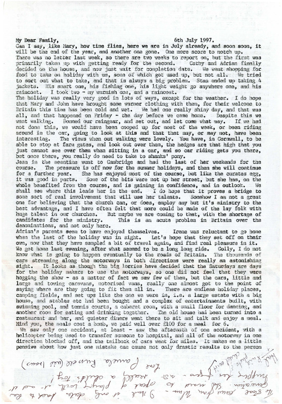 - A letter from Rev Dr and Mrs S H Russell about their stay in Cheshire, England, written to Miss Jean Irons from Val de Grace, Pretoria, South Africa, dated 6th July 1977.