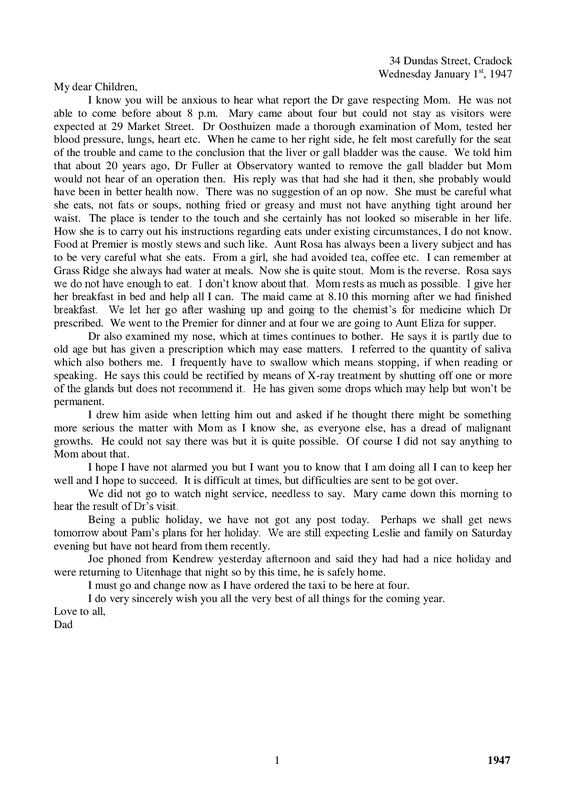 - Charles Butler, 1864-1949, wrote letters to family members, mostly his children, between 1932 until his death in 1949. During these years travelling with his wife, visiting family members in Kroonstad, Cape Town, Bloemfontein, Vryburg and also went on holiday trips. Their permanent address was 34 Dundas Street, Cradock, where they lived until the death of his wife, Mary Emma Butler, 1862-1947, who died in 1947. He then moved and stayed with his daughter Grace and her family in Kroonstad, 47 Reitz Street. During this time Charles and Grace visited relatives in Vryburg, Cape Province. Towards the end of 1948 when Charles's health deteriorated they stayed with family in Uitenhage to be close to the doctors and hospital. Charles Butler was buried in Cradock with his wife.