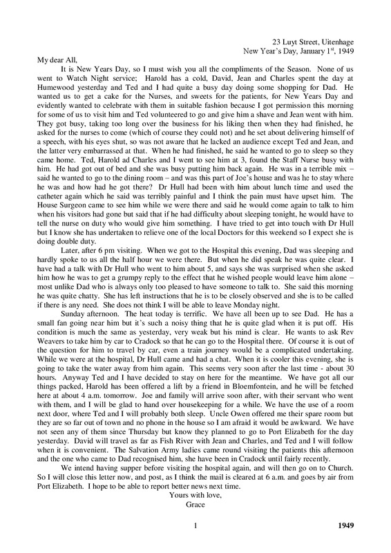 - Charles Butler, 1864-1949, wrote letters to family members, mostly his children, between 1932 until his death in 1949. During these years travelling with his wife, visiting family members in Kroonstad, Cape Town, Bloemfontein, Vryburg and also went on holiday trips. Their permanent address was 34 Dundas Street, Cradock, where they lived until the death of his wife, Mary Emma Butler, 1862-1947, who died in 1947. He then moved and stayed with his daughter Grace and her family in Kroonstad, 47 Reitz Street. During this time Charles and Grace visited relatives in Vryburg, Cape Province. Towards the end of 1948 when Charles's health deteriorated they stayed with family in Uitenhage to be close to the doctors and hospital. Charles Butler was buried in Cradock with his wife.
