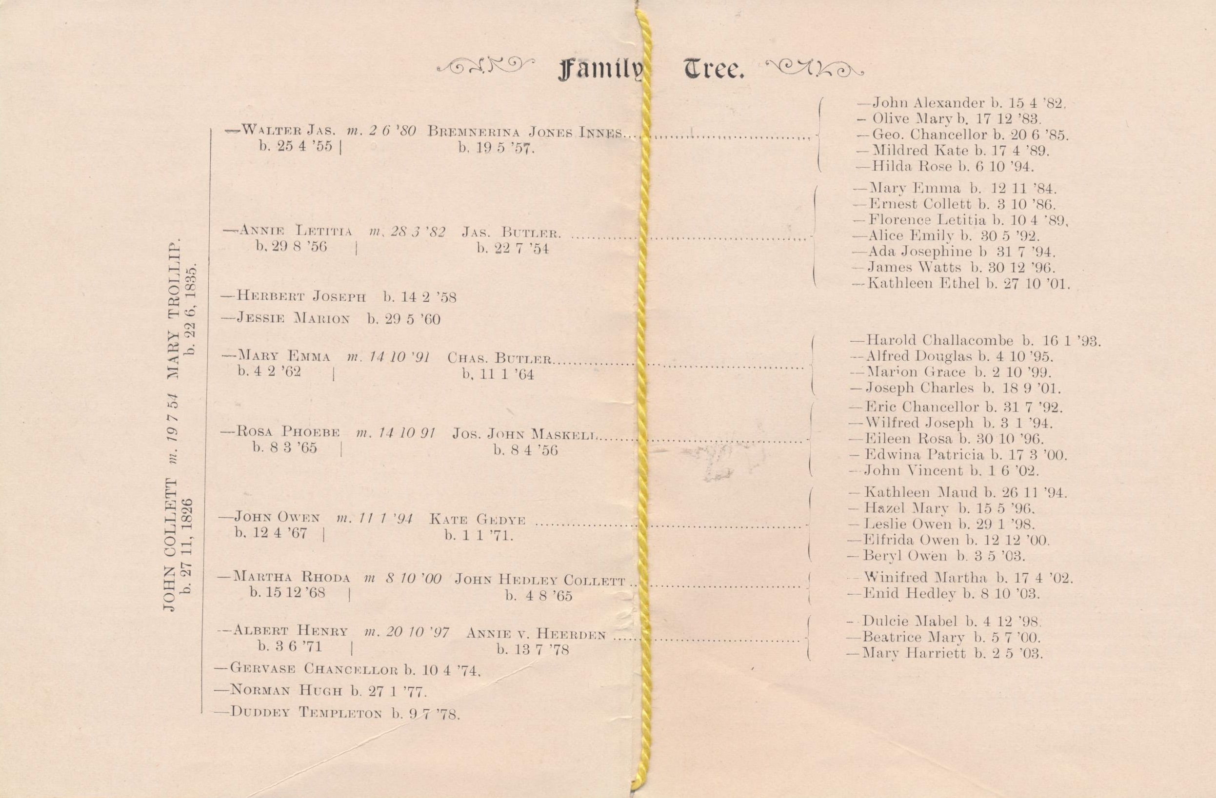 John Collett and Mary Collett nee Trollip, family tree and service sheet during their golden wedding anniversary, 1904