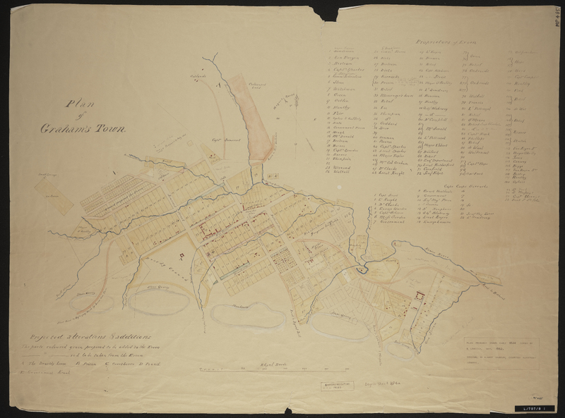 Lewcock, E, “Plan of Graham's Town, Plan of Grahamstown”, Surveyor General's Office, Cory Library and Historical Archives, accessed 29 December 2025, https://digitalarchives.ru.ac.za/s/cory/item/10582