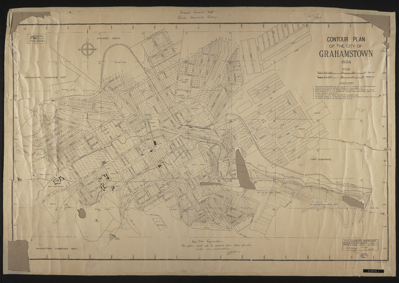 - Contour plan of Grahamstown, 1934. Drawn by A.W.M. ; signed by W.A. Hodge, City Engineer. "War time regulations: this plan must not be removed from college premises under any circumstances" signed by E H Wied.