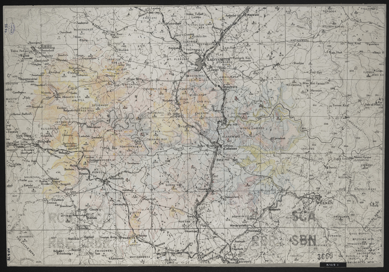 - Photograph of a map of the area around Ladysmith, mainly south of the town.Probably a copy of part of a general topographical series.