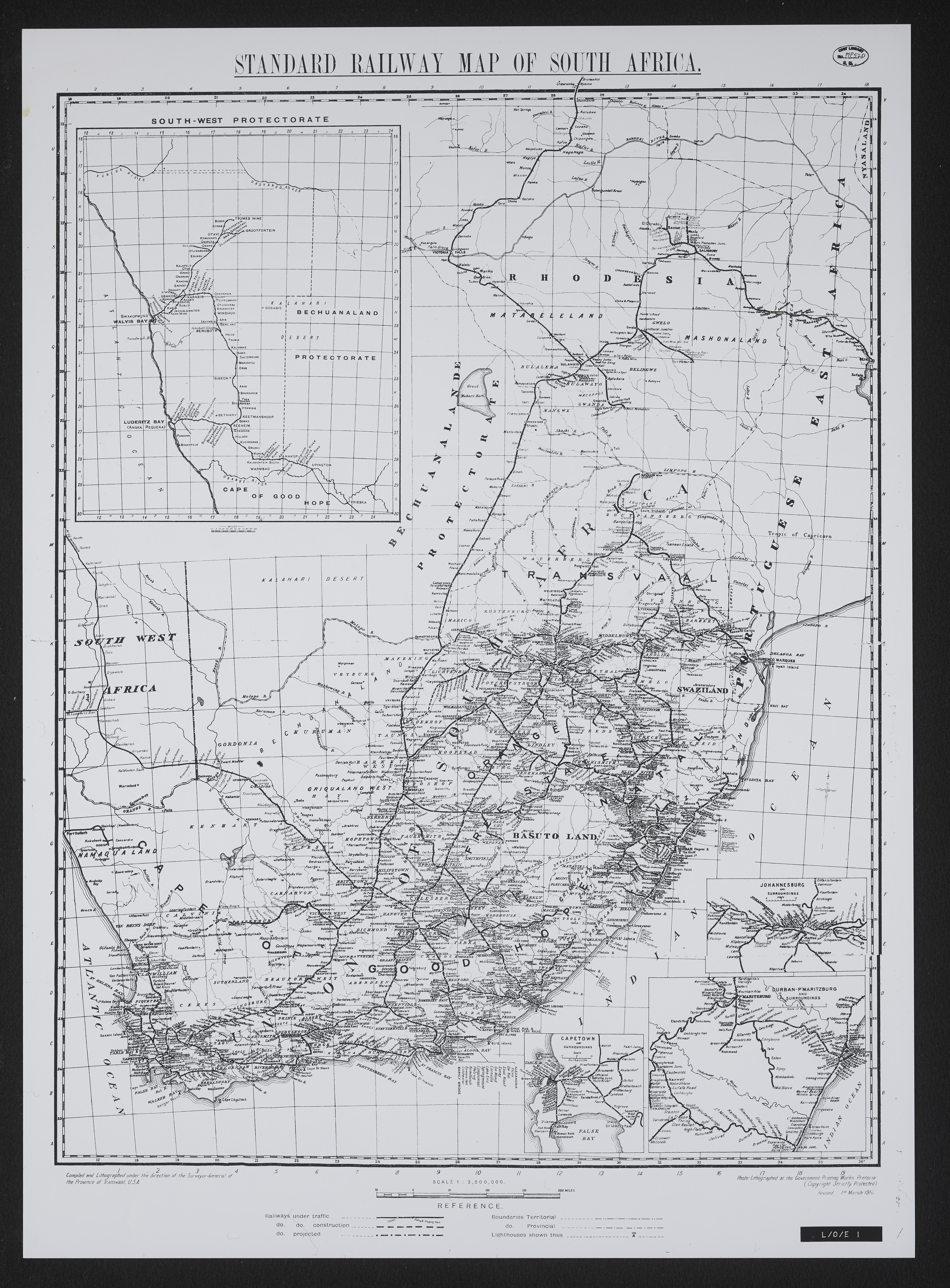 Surveyor General, “Standard railway map of South Africa”, Government Printing Works, Cory Library and Historical Archives, accessed 29 December 2025, https://digitalarchives.ru.ac.za/s/cory/item/10600