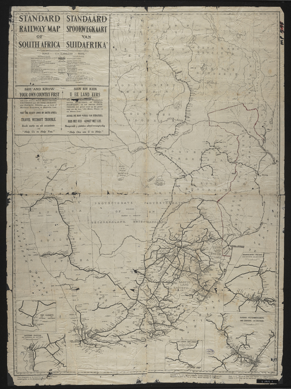 - Drawn in the office of the Chief Civil Engineer, SAR, Johannesburg. Photo-lithographed at the Government Printing Works, Pretoria,[1925]. Two undated railway maps appended.