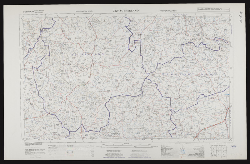 Trigonometrical Survey (South Africa), “3220 Sutherland, Sutherland 3220, Topo-cadastral series, Topo-kadastrale reeks”, Government Printer, Cory Library and Historical Archives, accessed 28 December 2025, https://digitalarchives.ru.ac.za/s/cory/item/10650