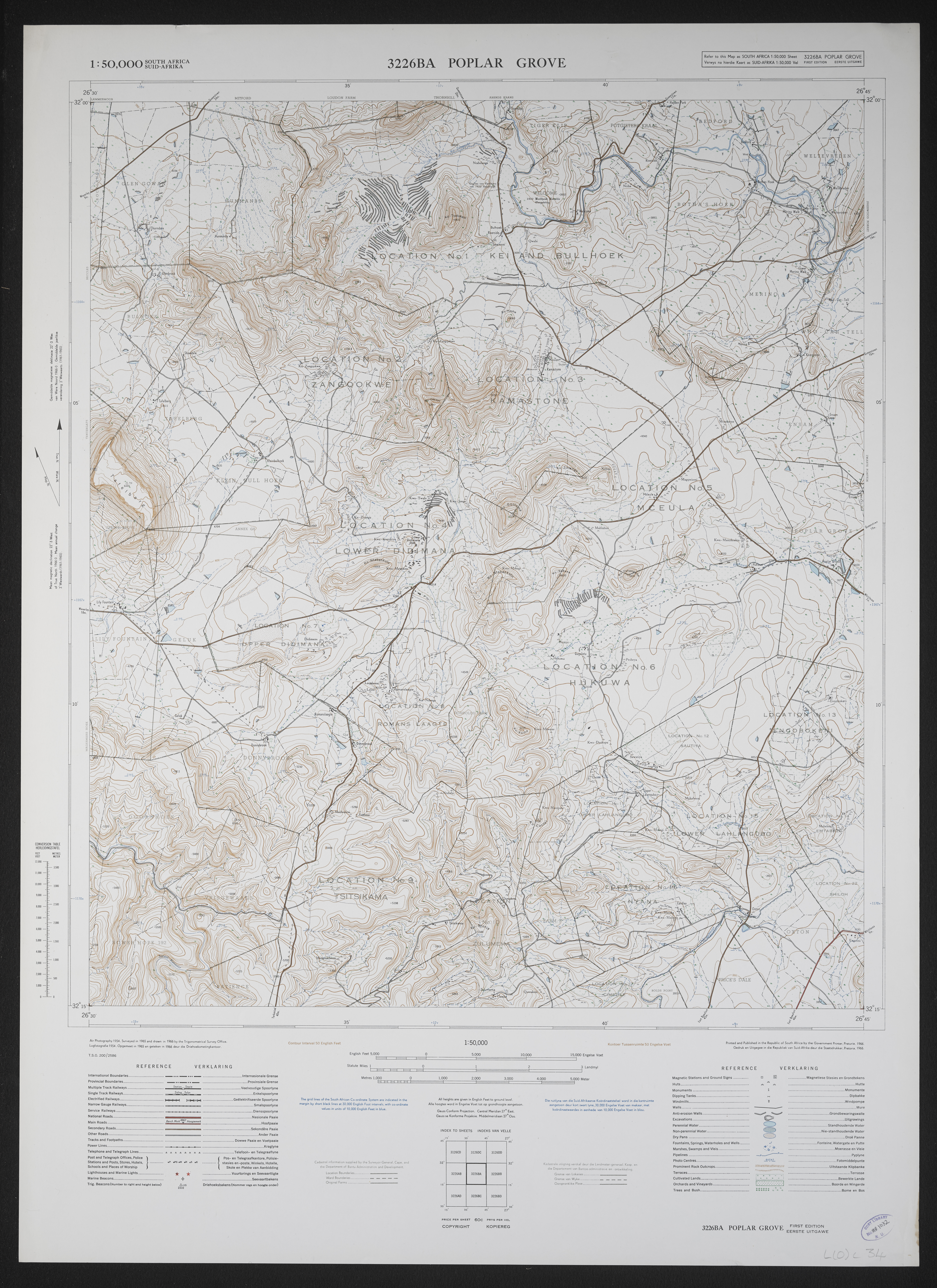 Trigonometrical Survey (South Africa), “3226BA Poplar Grove, Poplar Grove 3226BA, South Africa 1:50000 sheet, Suid Afrika 1:50000 vel”, Government Printer, Cory Library and Historical Archives, accessed 28 December 2025, https://digitalarchives.ru.ac.za/s/cory/item/10668