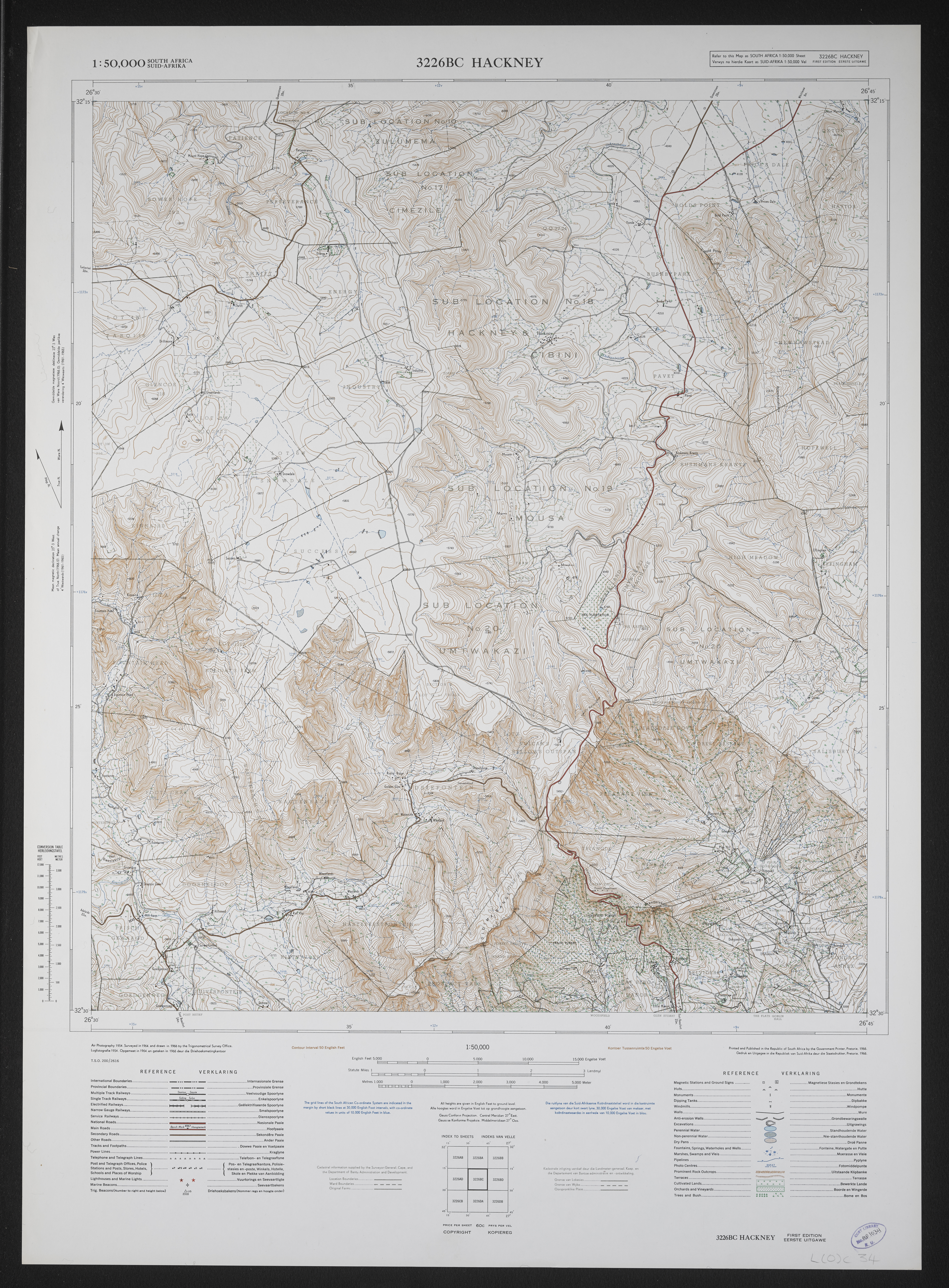 - 3226BC Hackney, South Africa 1:50000 sheet. Air photography 1954. Surveyed in 1964 and drawn in 1966 by the Trigonometrical Survey Office. Lugfotografie 1954. Opgemeet 1964 en geteken in 1966 deur die Driehoeksmeting Kantoor. T.S.O. 200/2616.