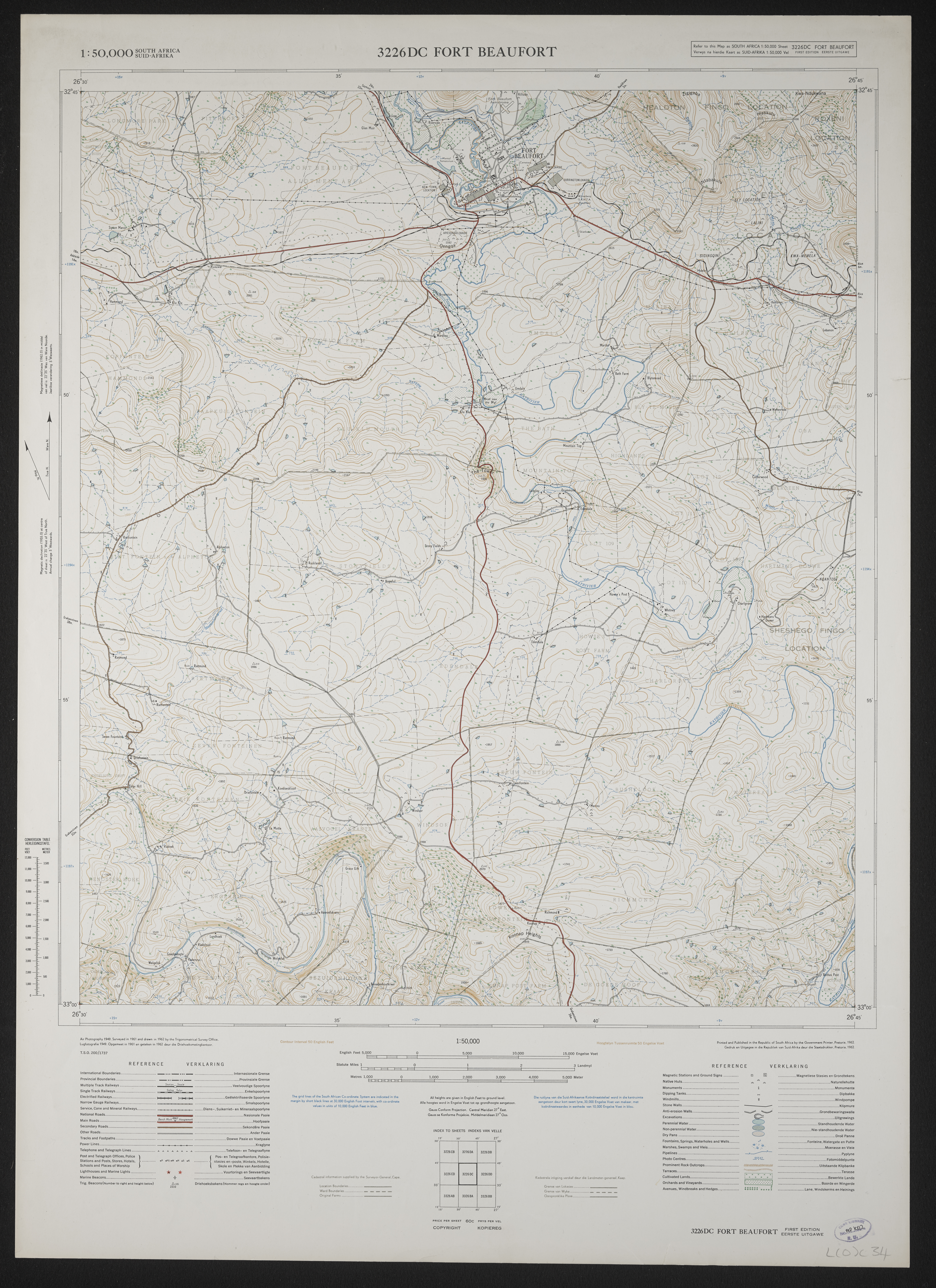 - 3226 Fort Beaufort, South Africa 1:50000 topo-cadastral sheet, Suid Afrika 1 : 50000 topo-kadastrale vel, Kadastrale informasie verskaf deur die Landmeter-Generaal, Kaap. TSO 200/1737. Air photography 1949. Surveyed in 1961 and drawn in 1962 by the Trigonometrical Survey Office. Lugfotografie 1949. Opgemeet 1961 en geteken in 1962 deur die Driehoeksmeting Kantoor. First edition.