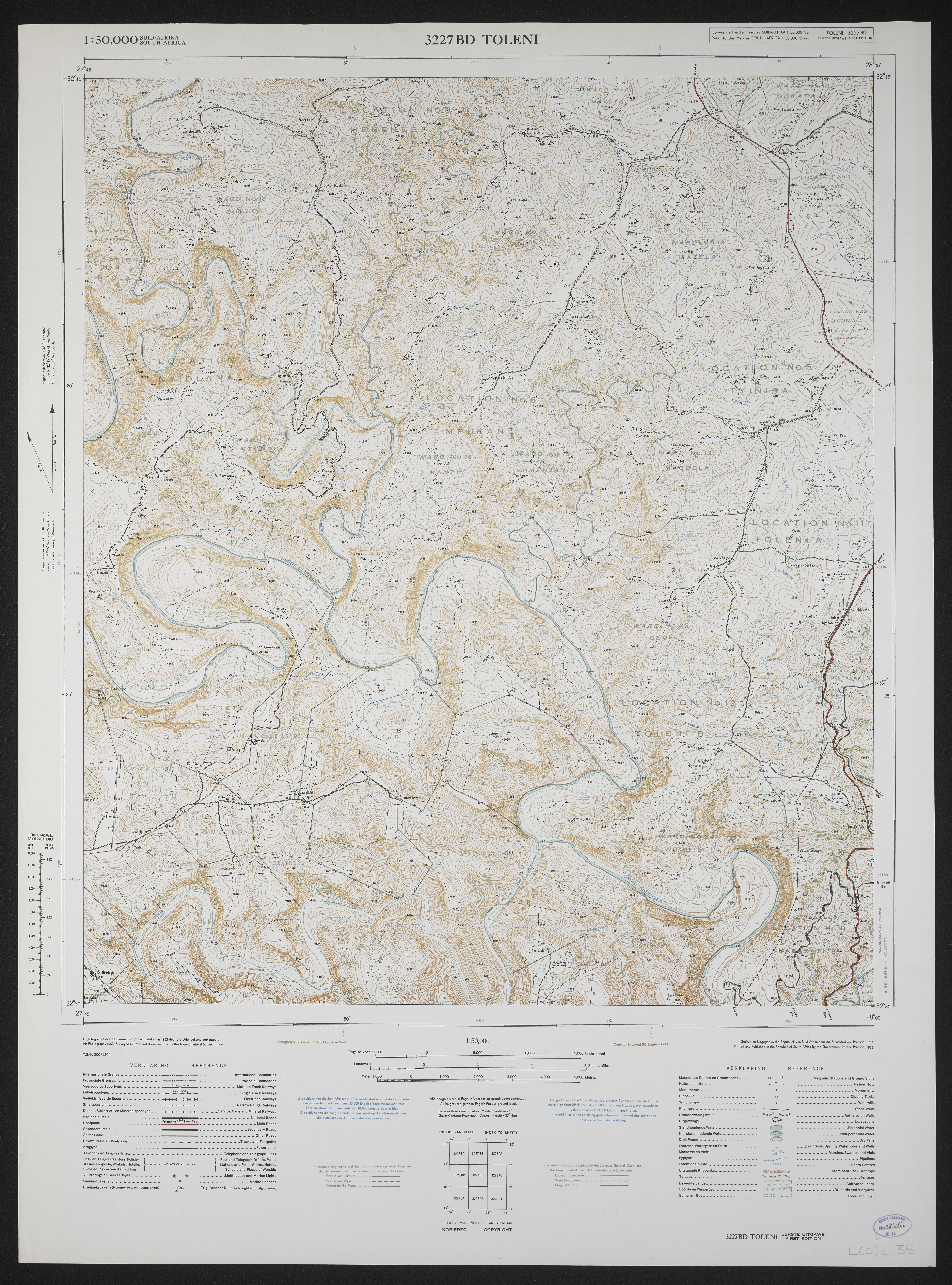 - 3227BD Toleni, South Africa 1:50000 sheet. Air photography 1950. Surveyed in 1951 and drawn in 1963 by the Trigonometrical Survey Office. Lugfotografie 1950. Opgemeet in 1951 en geteken in 1963 deur die Driehoeksmeting Kantoor. T.S.O. 200/1804. Cadastral information supplied by the Surveyor General, Cape. First edition