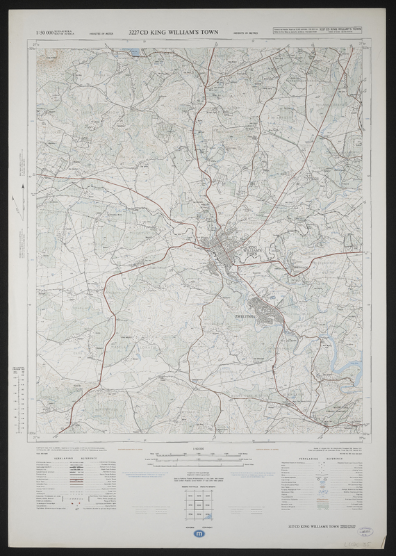 - 3227CD King William's Town, South Africa 1:50000 sheet. Air photography 1964. Surveyed in 1971 and drawn in 1972 by the Trigonometrical Survey Office. Lugfotografie 1964. Opgemeet in 1971 en geteken in 1972 deur die Driehoeksmeting Kantoor. T.S.O. 200/5493. Kadastrale inligting verskaf deur die Landmeter, Kaap. Second edition,Second edition