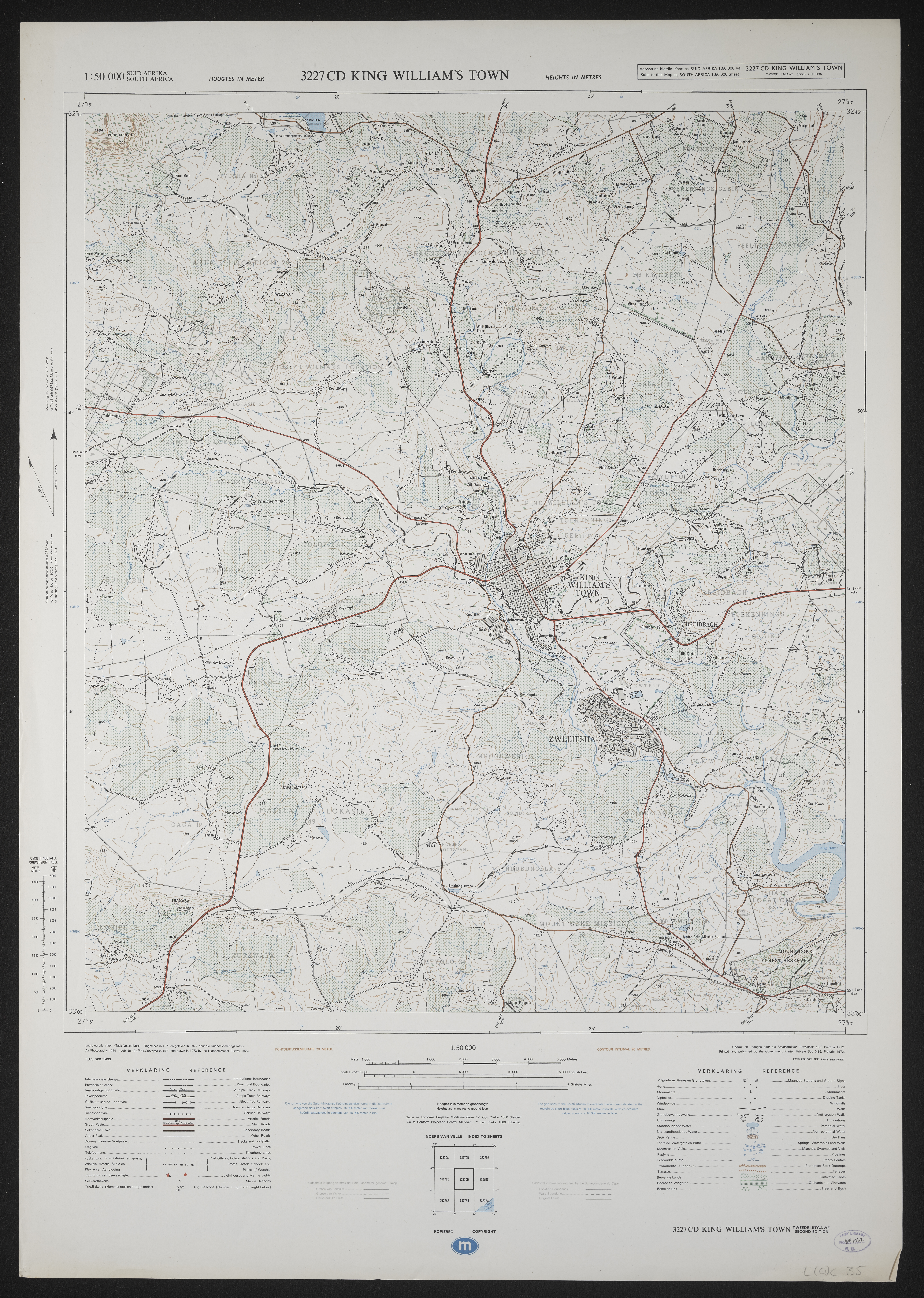 Trigonometrical Survey (South Africa), “3227CD King William's Town, King William's Town 3227CD, South Africa 1:50000 sheet, Suid Afrika 1:50000 vel”, Government Printer, Cory Library and Historical Archives, accessed 28 December 2025, https://digitalarchives.ru.ac.za/s/cory/item/10702